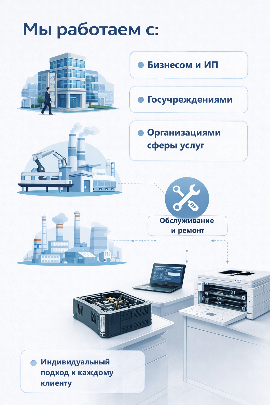В рамках сотрудничества мы берем на себя полный цикл работ: диагностику, ремонт, профилактическое обслуживание и контроль состояния оборудования. Возможна работа с партиями устройств — от офисной техники до специализированного оборудования. За каждым клиентом закрепляется персональный менеджер, который координирует все этапы и оперативно решает возникающие задачи.